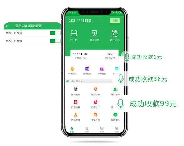 语音播报到账信息,有效防止逃单漏单,莫名损失不再有。